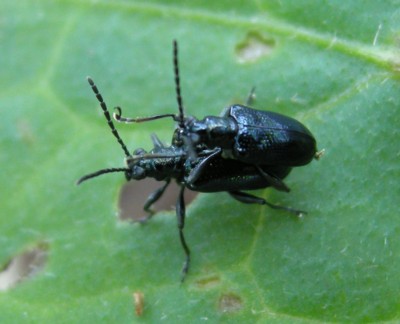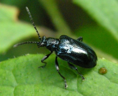 このような瑠璃色をしたハムシはたくさん居て、まだしっかり見極める事が出来ずに敬遠しがちだ。その中で、このクビボソハムシの仲間はまだ見分け易いほうだろう。 |