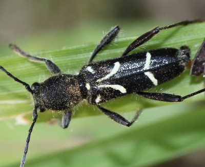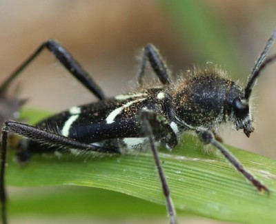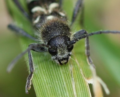 ・上翅は光沢のある黒色で、白色の斑紋があり、全体に白っぽい長い毛が生えている。