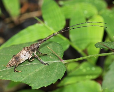 | ・上面全体に縦条の縞模様をしたカミキリムシ。頭頂に3本、前胸背に11本の黒条、上翅には各数本の淡褐色と黒褐色の縦条がある。 |