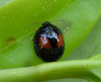 毒を持つテントウムシの仲間に擬態したと言われ、特に「アカボシテントウ」に良く似ている。近似種に「ヘリグロテントウノミハムシ(A. coccinellformis)」と言うのが居るようですが、何処で見分けるのか解かりません。4つ星です。 |