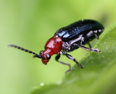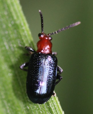 ・頭部と胸部は赤茶色、上翅は光沢のある青藍色をしたクビボソハムシ。