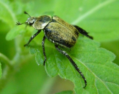 多分、間違ってないとは思いますが・・・似た「アシナガコガネ」との見分けが良く解りません。本種の頭楯の前縁は直線で、「アシナガコガネ」はわずかに彎入するそうです。4つ星。 |