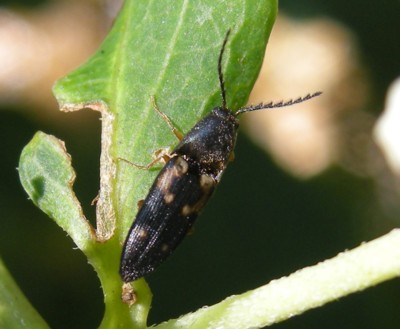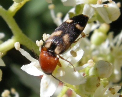 | ・雌の胸部が赤褐色をしたコメツキムシ。上翅は黒色で、黄白色の斑紋がある。 |