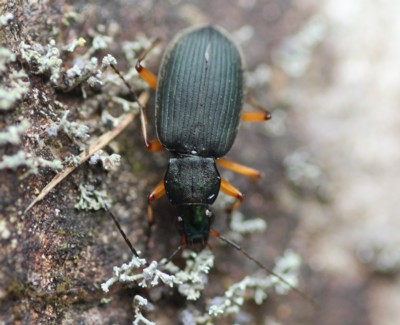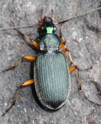 似た種が幾つかある中、見つけた場所や触角の色などで判断しました。良く似た「コガシラアオゴミムシ(C. variicornis)」の触角は、第1〜3節が黄赤褐色をしているようです。 |