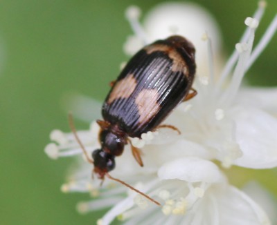 | ・頭部と前胸背板は暗赤褐色(胸部側縁の上反部は黄褐色)。上翅の中央前方と翅端に黄褐色の横帯紋がある。 |