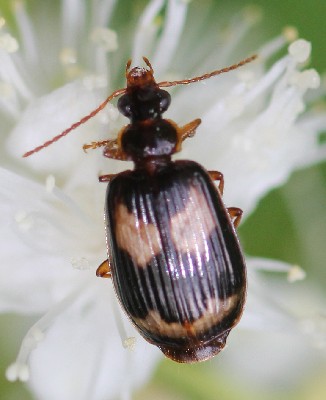「ジュウジ」とは上翅の黒褐色の部分が「十字」に見えることからのようです。保育社の図鑑では、「ジュウジアトキリゴミムシ属(Lebia)」は幾つかあるのですが、その中でまともに十字に見えるものは「Lebia亜属」の「クロズジュウジアトキリゴミムシ(L