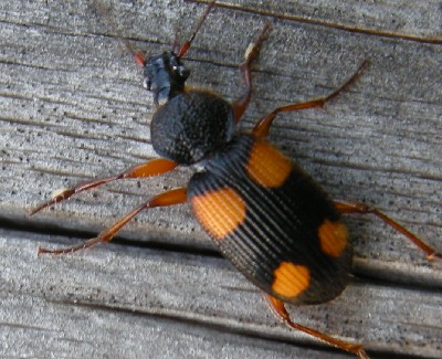 | ・黒褐色の上翅に橙色の斑紋が4個あるゴミムシの仲間。 |