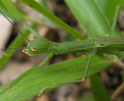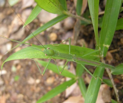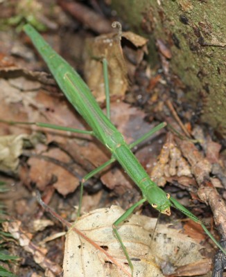 飛んで来たと言うか、落ちて来たと言うか、歩いてる途中に偶然下草に止まった。「トビナナフシ(M.phluctanoides)」と良く似ているそうだが、複眼が半円形になるほど突出している事、頭部・胸部が一様に同じ色をしている事から判断しました。(トビナナフシの方は頭部・胸部の両側に明瞭な黄色い縦条がある。)