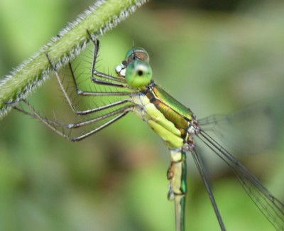 本種では、胸部側面の金属緑斑の上端が側縫線に届きますが、「アオイトトンボ」は側縫線に届きません。また、尾部付属器でも解るようですが、そこまではっきりとした写真はなかなか撮れません。 |