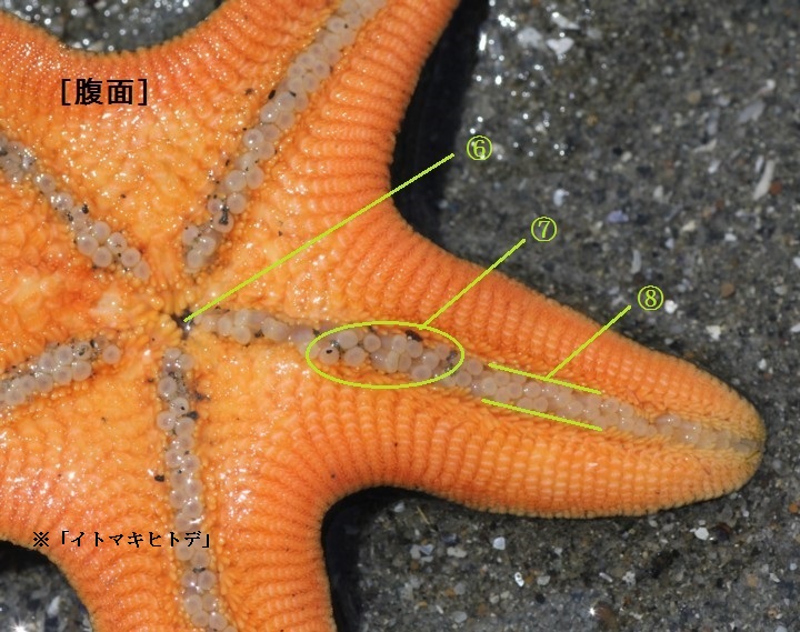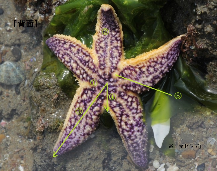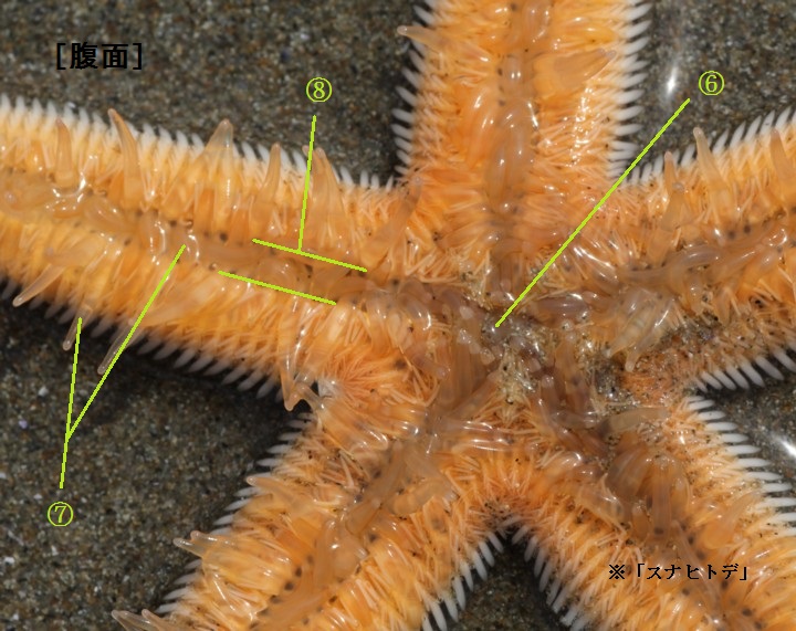 | A腕(わん) 盤から放射状に出ている部分で、内部には各種の器官がある。5本のものが多いが6本以上ある種もある。 |