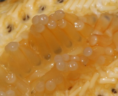 ・背面は白色〜淡黄色の地に青紫〜赤紫色の斑紋があるが、その斑紋は個体によって変化があり、一様に黄色い個体もある。