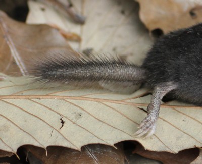 | ・体毛は全身ほぼ黒色。目は極めて小さく、鼻先は細長い。尾が棍棒状でブラシ状の毛が生えるのが特徴。 |