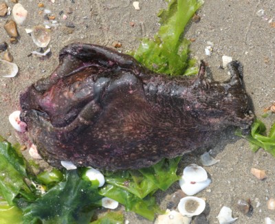 浜辺に打ち上げられて弱ったものを良く見かけます。何時も「アマクサアメフラシ」との判断に迷っていましたが、今回、まだ元気な個体を見つけ暫く触っていると紫色の汁を出しましたので本種だと言うことが解りました。「アマクサアメフラシ」は白色の汁を出すそうです。