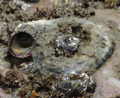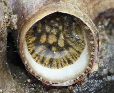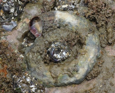 ・貝の一部、あるいは大半を岩盤に固着されて不規則に巻く、巻き貝の一つ。