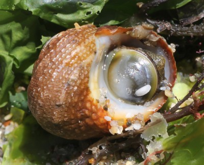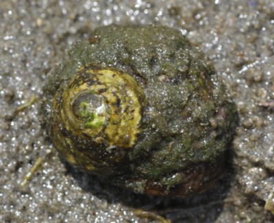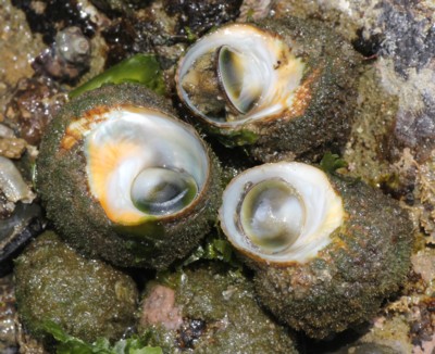 | ・普通に見られる種の一つで、殻の表面が「カイゴロモ」と言う緑藻に覆われることの多い貝。食用として利用される。 |