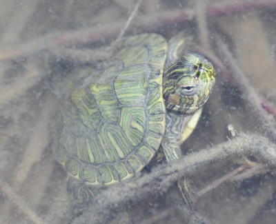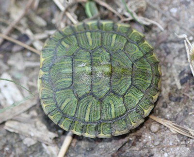・「ミドリガメ」の名でペットとして輸入されたものが野生化した。側頭部の赤い斑紋が特徴。