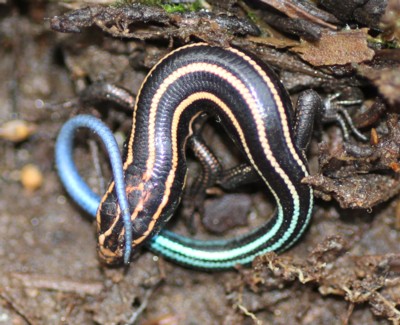 ・幼体は縞模様があり、尾は鮮やかな青色をしている。