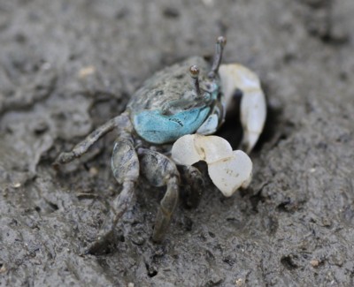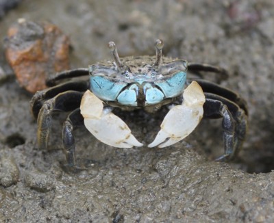 「コメツキガニ」より泥の多い所を好むようです。少し上流のドロドロの所、「ヤマトオサガニ」と同じ場所に居ました。小さいですが、ハサミが白くて顔が青色をしているので、集団でウェービングをしていると良く目立ちます。 |