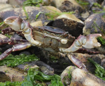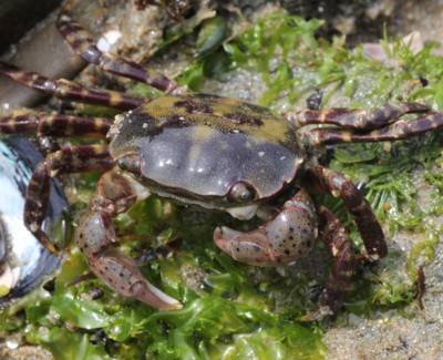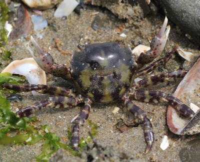 ・内海から外海まで、潮間帯の転石下で普通に見られるカニ。