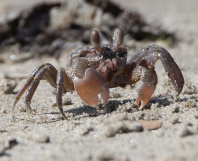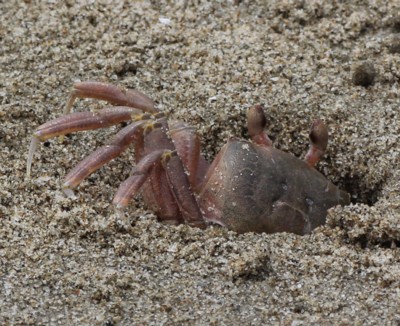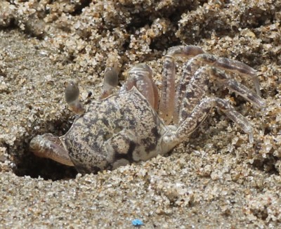 マクロレンズで接写しようと静かに近付くが、直ぐに穴へ逃げてしまう。穴のそばで暫く粘って待つも、なかなか出て来ない・・・。「コメツキガニ」や「チゴガニ」よりも警戒心が強く、また眼も良いようです。。望遠レンズに変えて何とか撮れましたが、正面からは良いのが撮れませんでした。