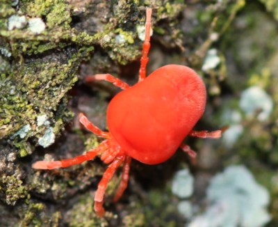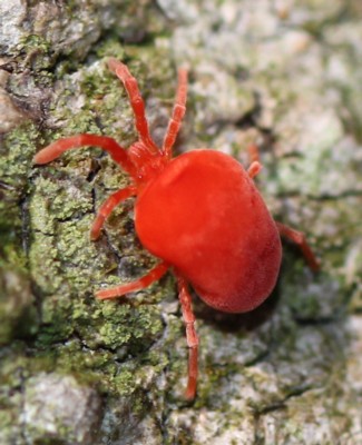 ・紅色の体にビロード状の細かい毛が密生したダニ。