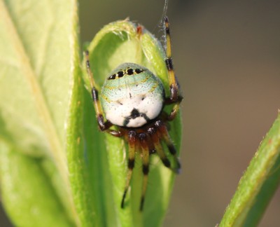 | ・腹部は中央白色で後方にいたり青緑色、前方に黒色環状の斑紋、中央に黒色小斑と黄色い横条、後端付近には黒斑が横に並ぶ。 |