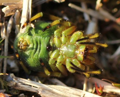 | ・背甲は赤褐色。歩脚は橙黄〜黄緑色で各節の末端に黒色環斑がある。 |