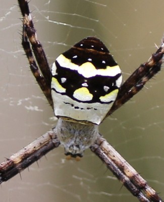 | ・他のコガネグモ類に似るが、本種は腹部の黄色い横条紋が途中で途切れる。 |