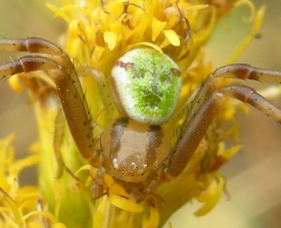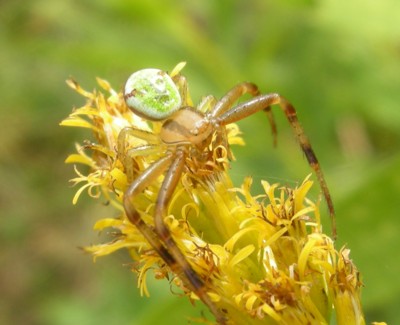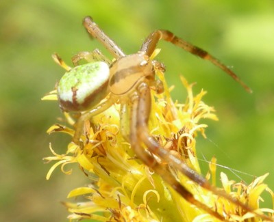 | ・緑色の腹部に褐色の斑紋がある美しいクモ。全国に生息する普通種。 |