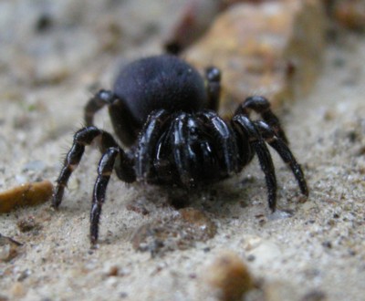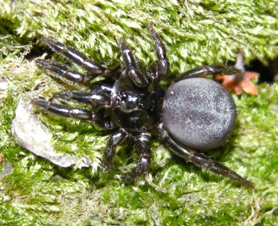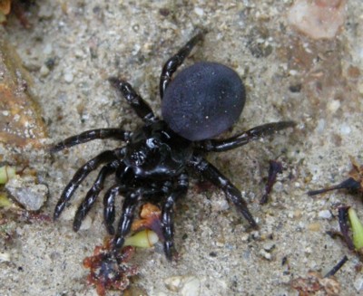 | ・全体に黒紫色(雌)をしたトタテグモ。触肢が長く歩脚が5対(10本)あるように見える。 |