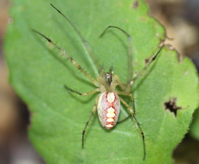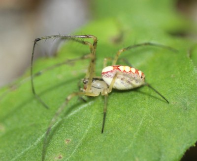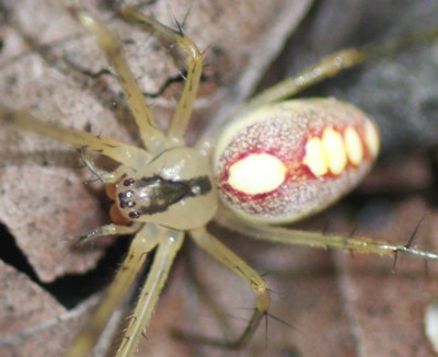 | ・腹部に赤く縁取られた黄色い斑紋のある美しいクモ。 |