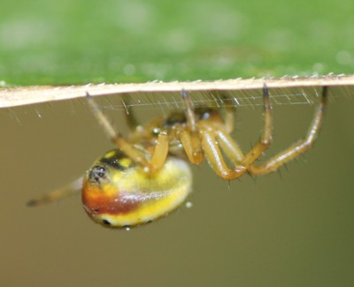 | ・腹部に6個(個体により4〜8個)の黒斑が特徴のクモ。里山〜山地に生息する。 |
