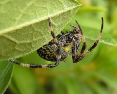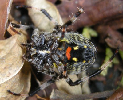 | ・黄褐色の地に黒褐色の複雑な葉状斑があるオニグモの仲間。腹部腹面にある赤と黄色の斑紋が特徴。 |