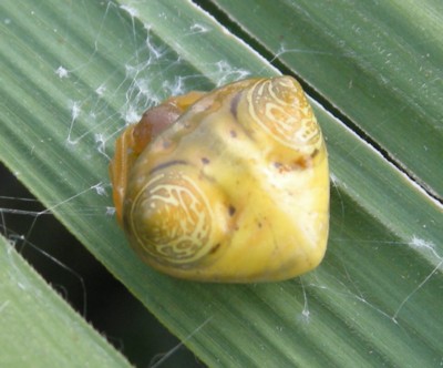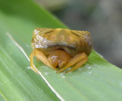 | ・「雌」 背甲、歩脚、腹部は黄色。腹部は長さ幅がほぼ同長で、後端が尖った三角形。腹部の前方両肩は隆起して、白っぽい環と不規則な斑紋が多数ある。 |