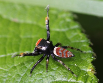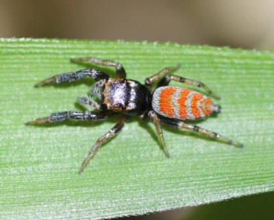 | ・腹部にある橙色の横帯が特徴の美しいハエトリグモ。平地〜山地まで広く生息する。 |
