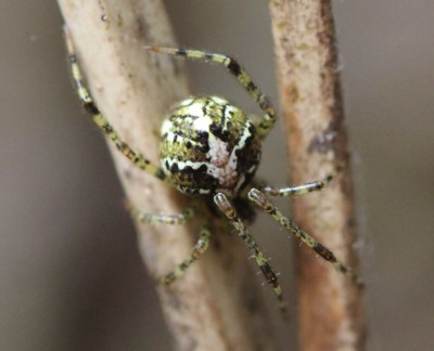 腹部上面の赤色斑がはっきりしない事や、頭胸部の写真が撮れてない事で迷いましたが、脚のマダラ模様や全体の雰囲気などから判断しました。間違ってないと思います。