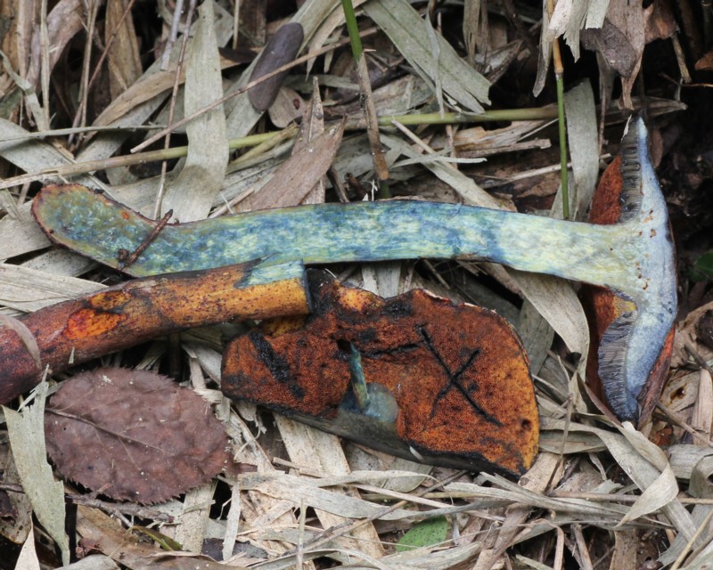 | ・傘色は変化に富み、褐色、帯赤褐色、帯黄褐色、または暗褐色で強くこすると暗青色に変わる。 |
