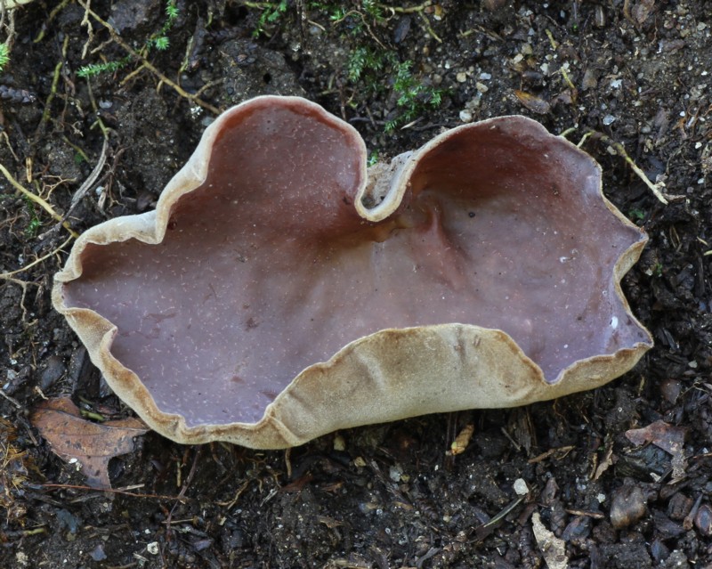 | ・背面は灰黄色〜灰褐色で直立した粗毛が密生する。腹面(子実層面)は平滑で褐色〜紫褐色。 |