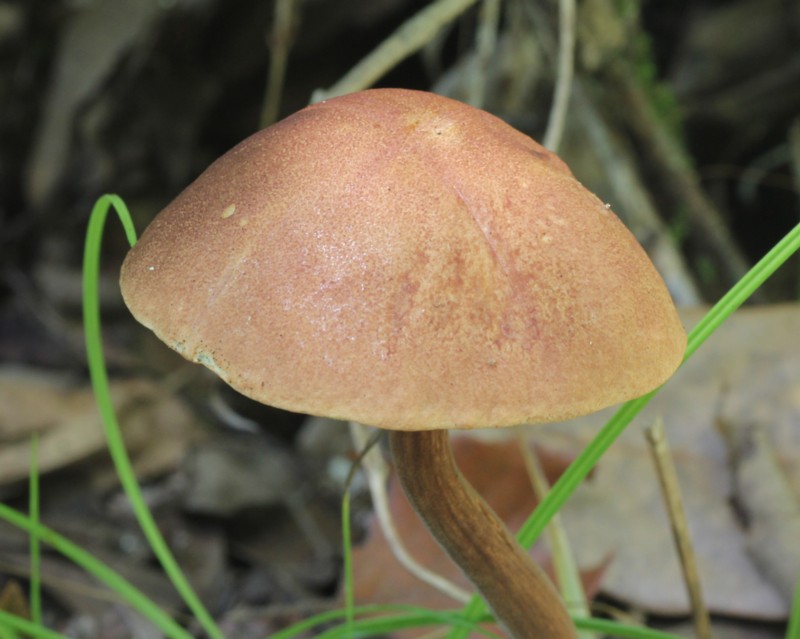 | ・傘/半球形→饅頭形→扁平。表面はややフェルト状で赤褐色〜クリ褐色〜帯紫褐色、湿時は弱い粘性がある。 |