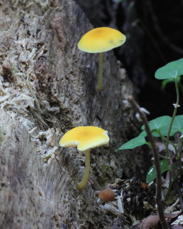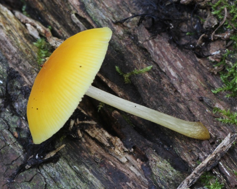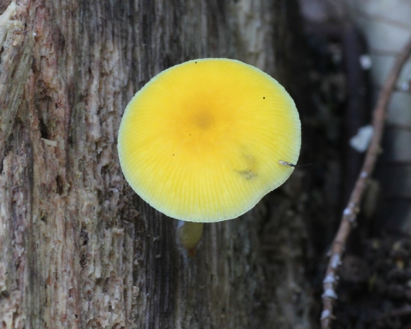 | ・傘/鐘形〜饅頭形→扁平。表面は平滑で鮮やかな黄色、湿時は周辺部に条線をあらわす。 |