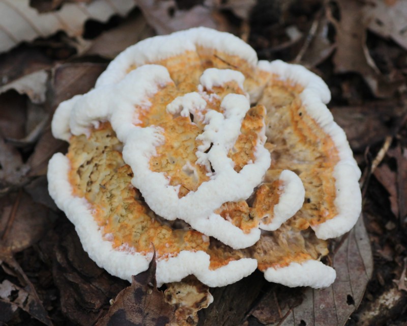 | ・子実体/基部より扇形〜へら形の傘を四方に開き、八重咲きの花状をなす。表裏とも橙色〜橙褐色で縁は白色。 |