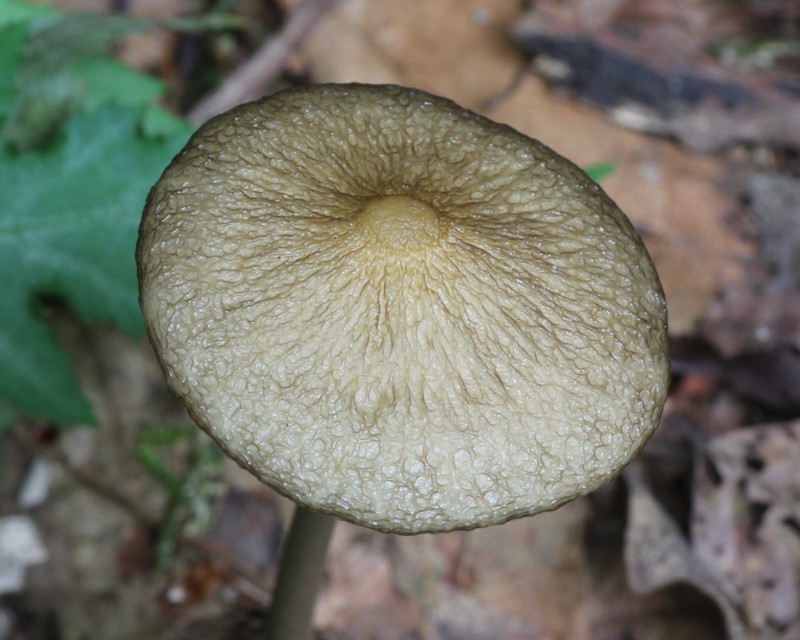 | ・傘/丸山形→中丘扁平→浅皿状。表面は湿時粘性があり淡褐色~灰褐色。中丘の裾から顕著なしわが放射状に広がり周辺で網目状をなす。 |