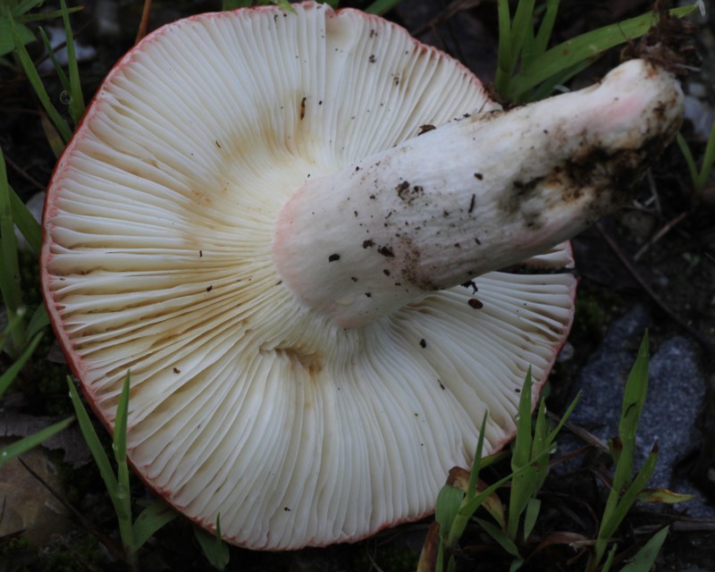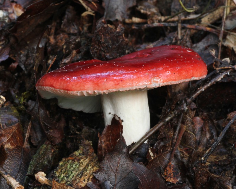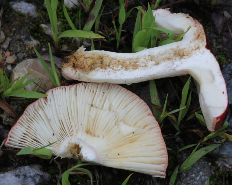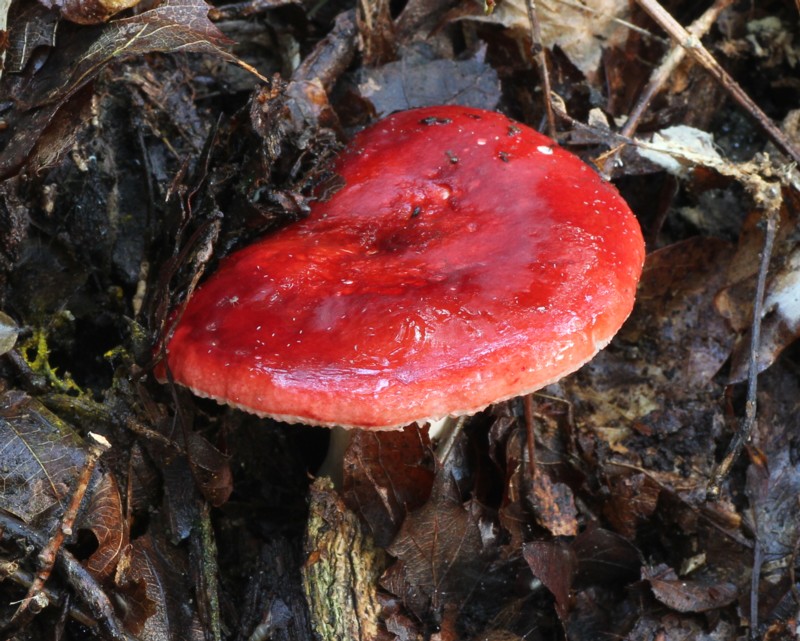 見た瞬間に本種だと思ったのですが、傘が赤い他のベニタケ類との判別は難しく、色々と迷いました。柄がほんのわずかですが淡紅色を帯びていることから判断しましたが、さて、どうでしょう・・・。 |