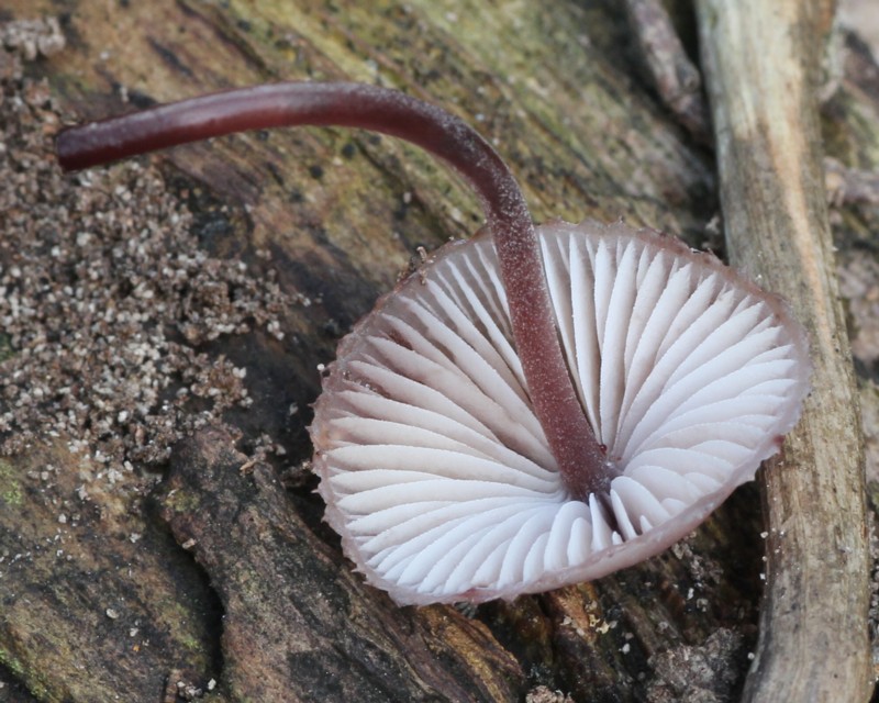 | ・柄/径2〜3mmで中空、傘と同色。基部に白色の粗い毛がある。傷をつけると暗赤色の液が出る。 |