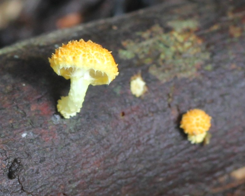 | ・傘/半球形→饅頭形→扁平。表面は粘性なく、橙黄色の地に綿屑状の橙色の鱗片を密布する。 |