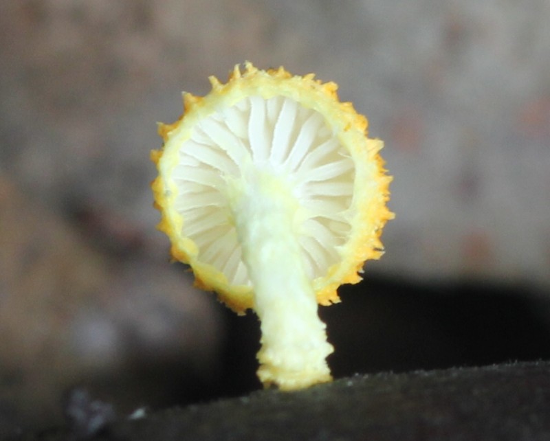 | ・柄/径1〜4mm、上下同径で根元は膨らむ。表面は淡黄色〜黄白色地に傘と同様の鱗片に覆われる。 |
