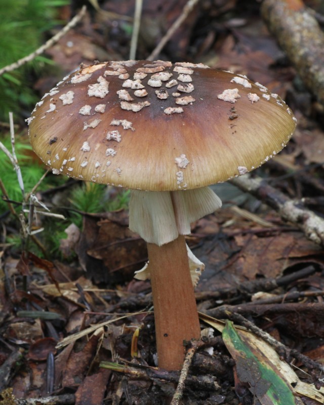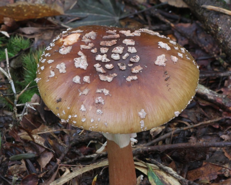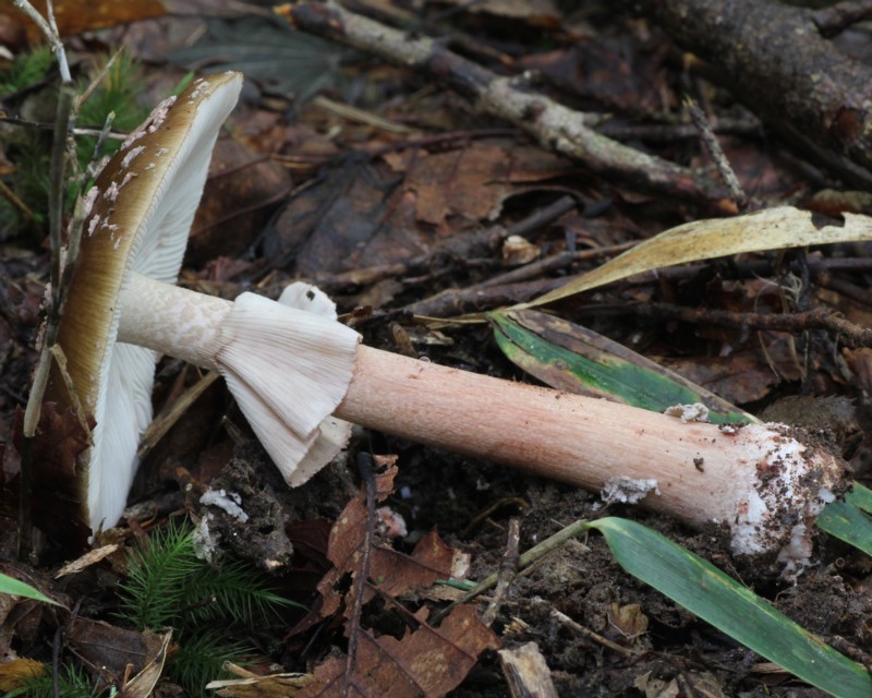 | ・柄/径6〜25mm、表面は淡褐色〜赤褐色で下方ほど濃くなる。上部には白色膜質のつばがあり、基部は球根状に膨らみ粉粒状のつぼの破片を付着する。 |