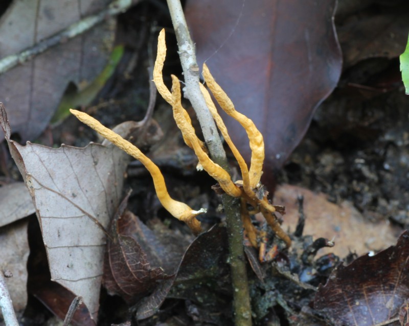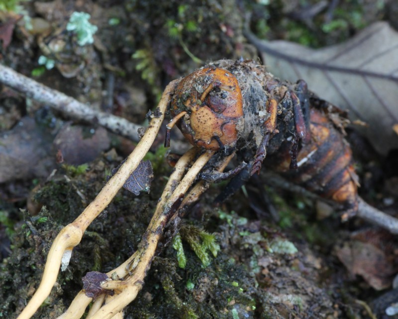 追記・・・写真の個体は結実部(頭部)の先端が尖る別種の「トガリスズメバチタケ(O. oxycephala)かもしれません。『冬虫夏草生態図鑑/日本冬虫夏草の会』では、「形態的な差はほとんどなく、同種として扱うのが適当かもしれない。今後の解析が待たれる。」との事です。情報量も少なく詳しい事は解りませんので、『ハチタケ』として掲載、解説しています。 |