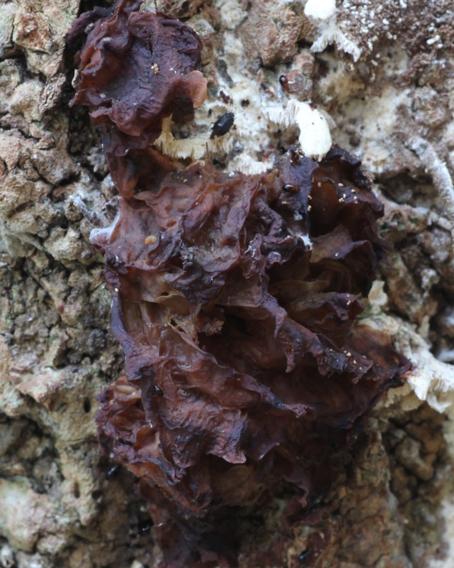 | ・子実体/花びら状裂片が重なり合って八重咲きの花状になる。色は淡褐色〜赤褐色でゼラチン質。 |