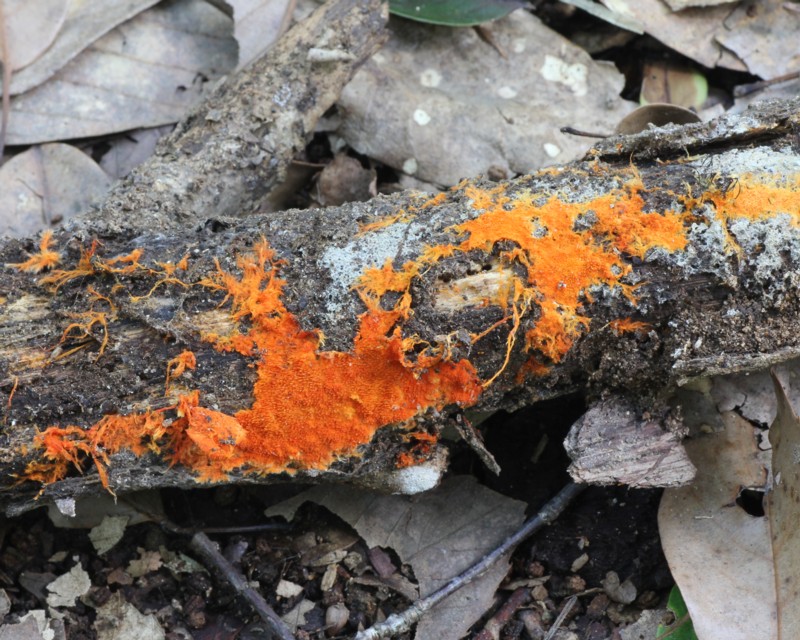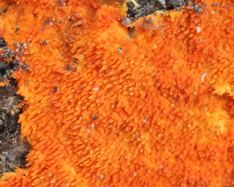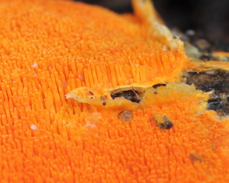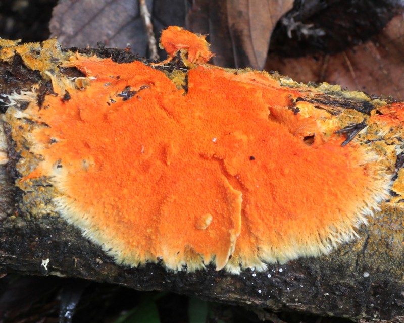 | ・全体に橙黄色〜橙赤色、膜質で期物から剥がれやすい。通常、周辺部に黄橙色の菌糸束を形成する。 |